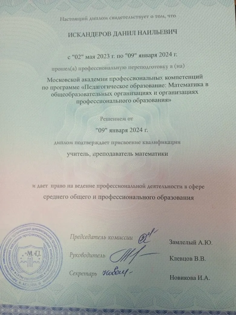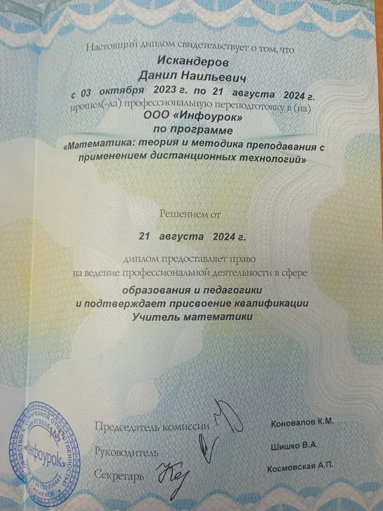 Меня зовут Искандеров Данил Наильевич, уже более 11 месяцев я преподаю онлайн, используя профессиональные инструменты для репетиторов от Geoma.