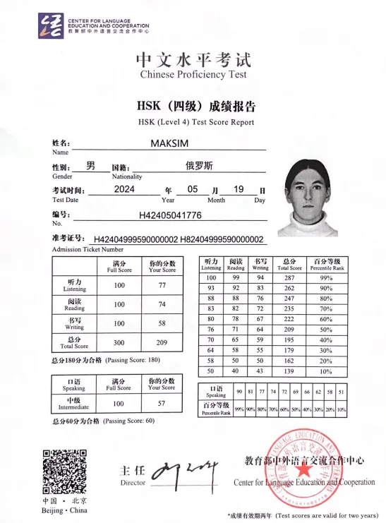 🐉С сентября 2023 года до июля 2024 года жил в Китае, провинция Ганьсу, Ланьчжоу. В 2024 году сдал международный экзамен HSK4 на 210 баллов.